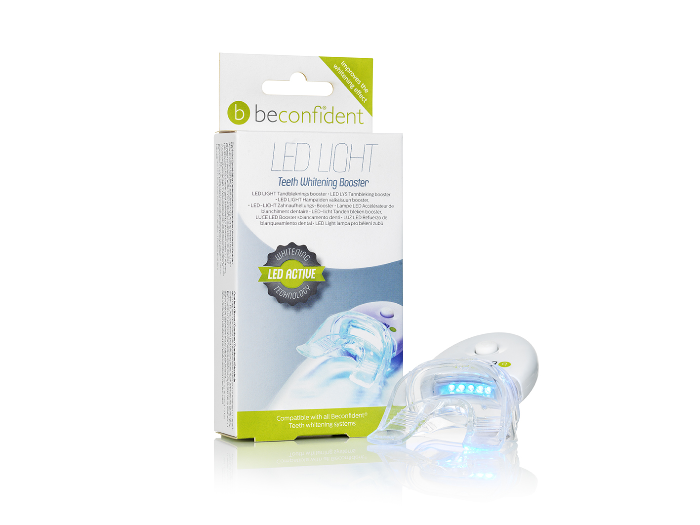 SPECIAL KAMPANJ NU – Med Beconfident® LED Booster Light så både förbättrar och förlänger du resultatet av din tandblekning. Den är speciellt utvecklad för att användas tillsammans med Teeth Whitening Pro Kit då gelen innehåller Ferrous Gluconate som aktiveras av LED-ljuset och gör din tandblekning ännu mer effektiv.